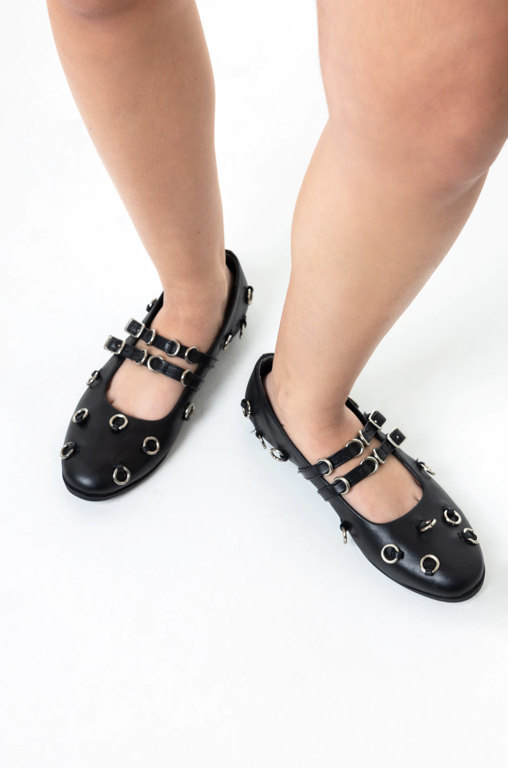 Chatas de cuero con accesorios tipo piercings. Industria Argentina.