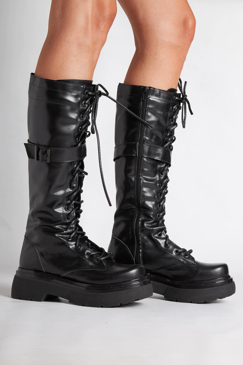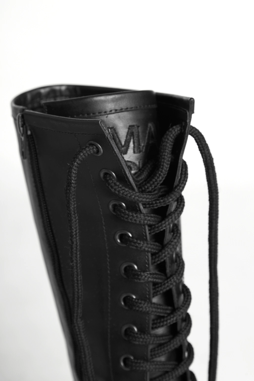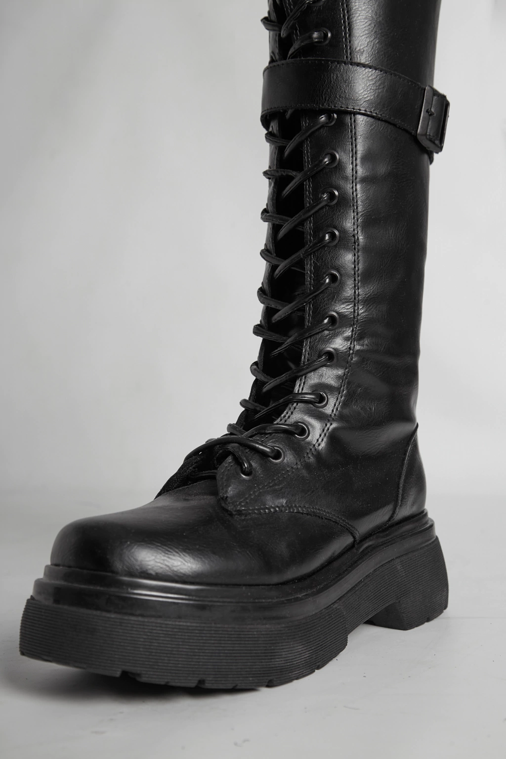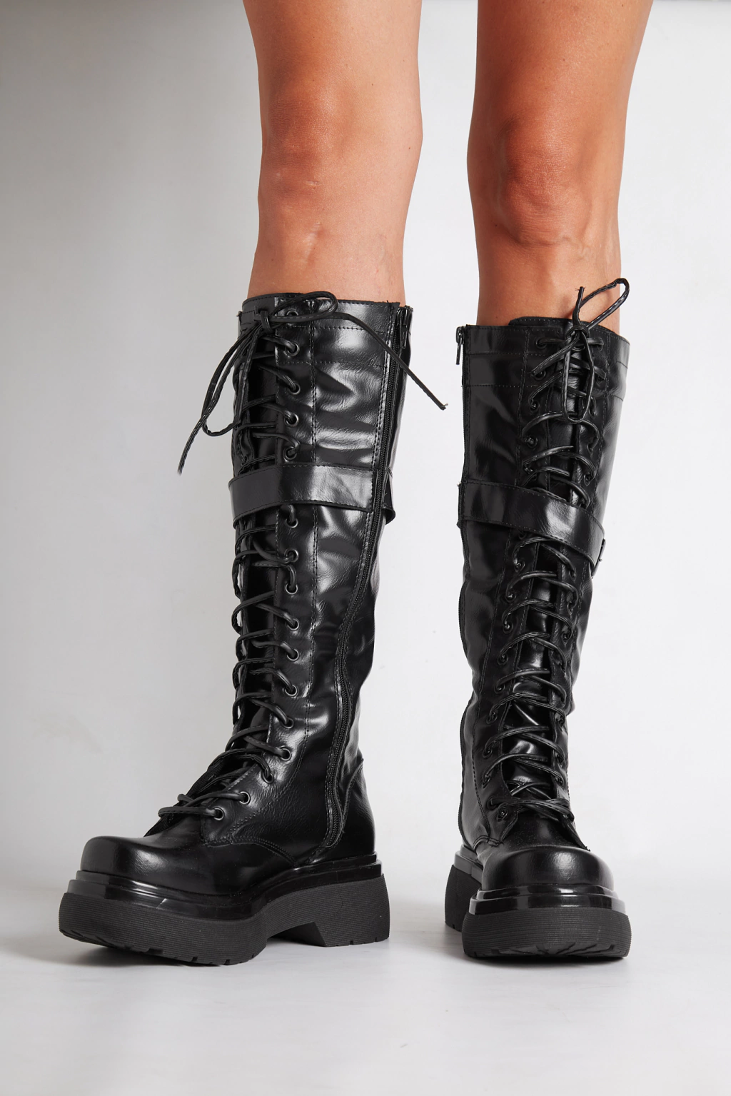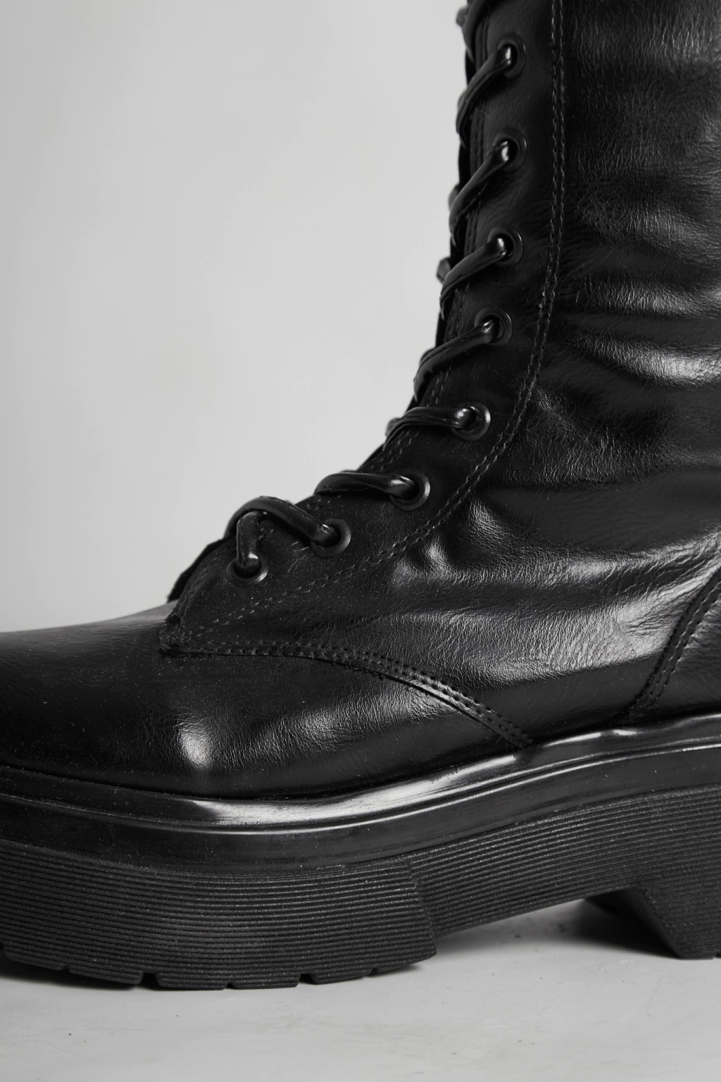 Borcegos de ecocuero con cordón de cuerina. Taco 3,5 cm, caña 17 cm. Talle 35: 23 cm | Talle 36: 23,5 cm | Talle 37: 24 cm | Talle 38: 24,5 cm | Talle 39: 25 cm | Talle 40: 25,5 cm