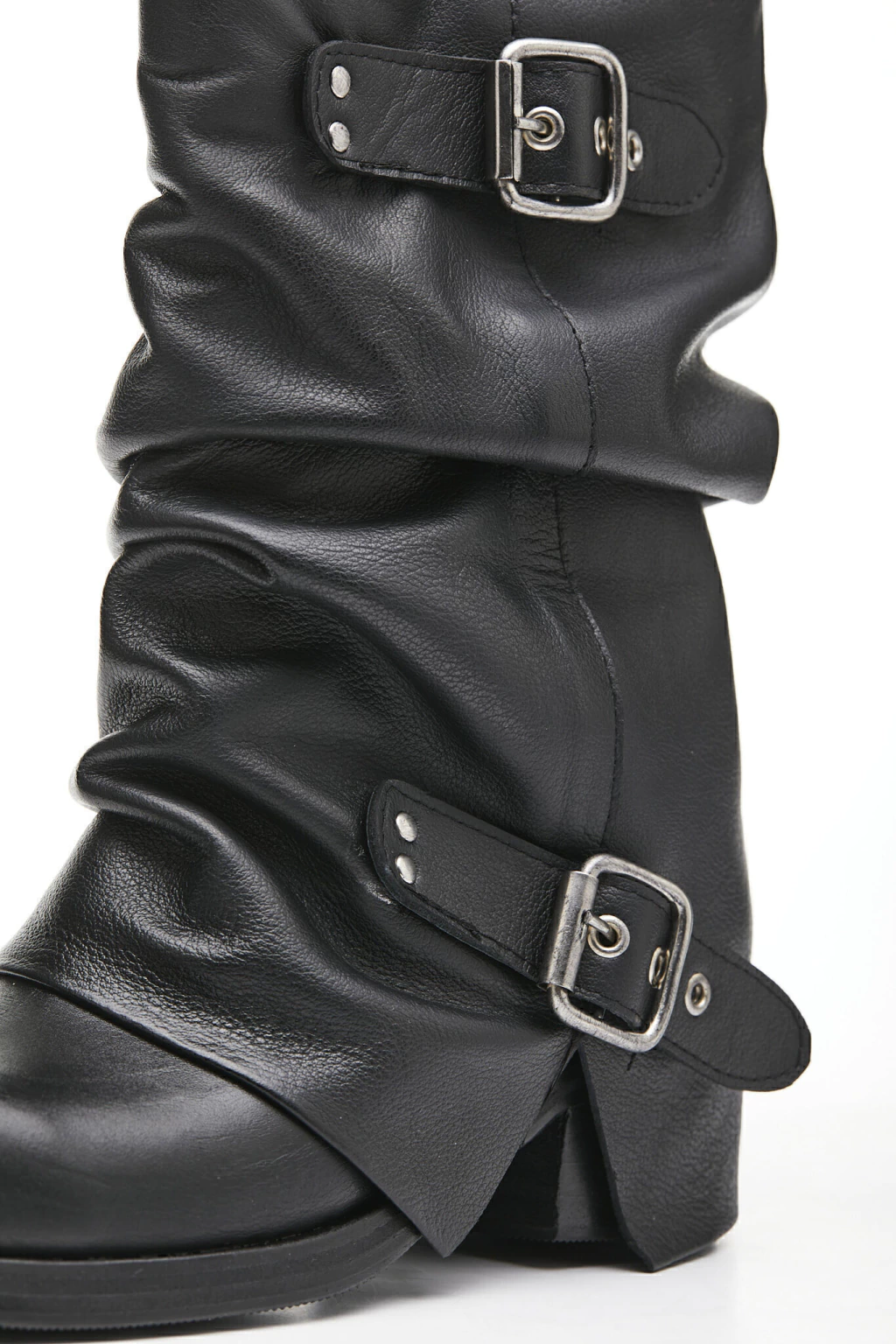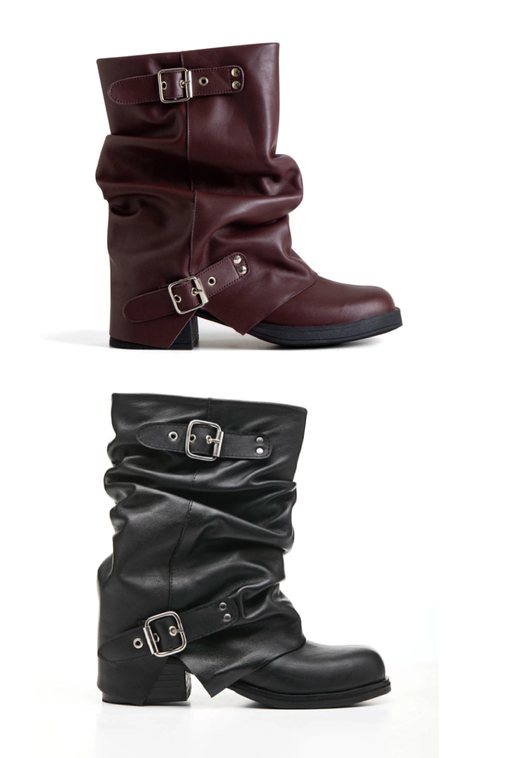 Mid-calf leather boots with buckle details. Boot shaft height: 8.6 in heel height: 1.7 in and calf circumference: 14.1 in (may vary depending on size). Made in Argentina.