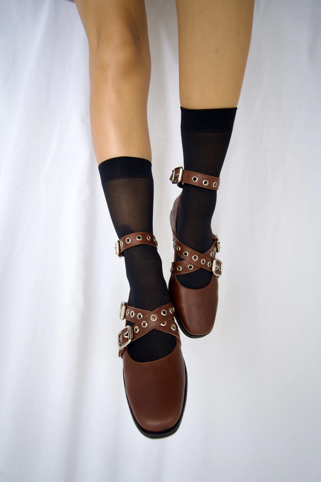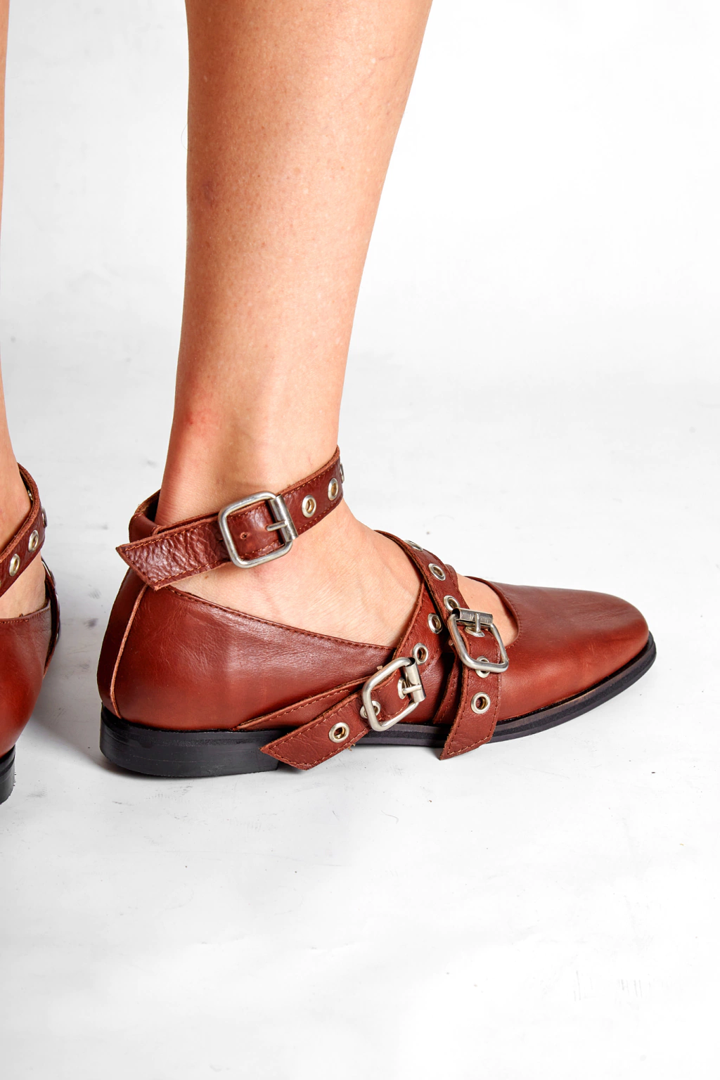 Chatas de cuero con tiras cruzadas con tachas. Industria Argentina.